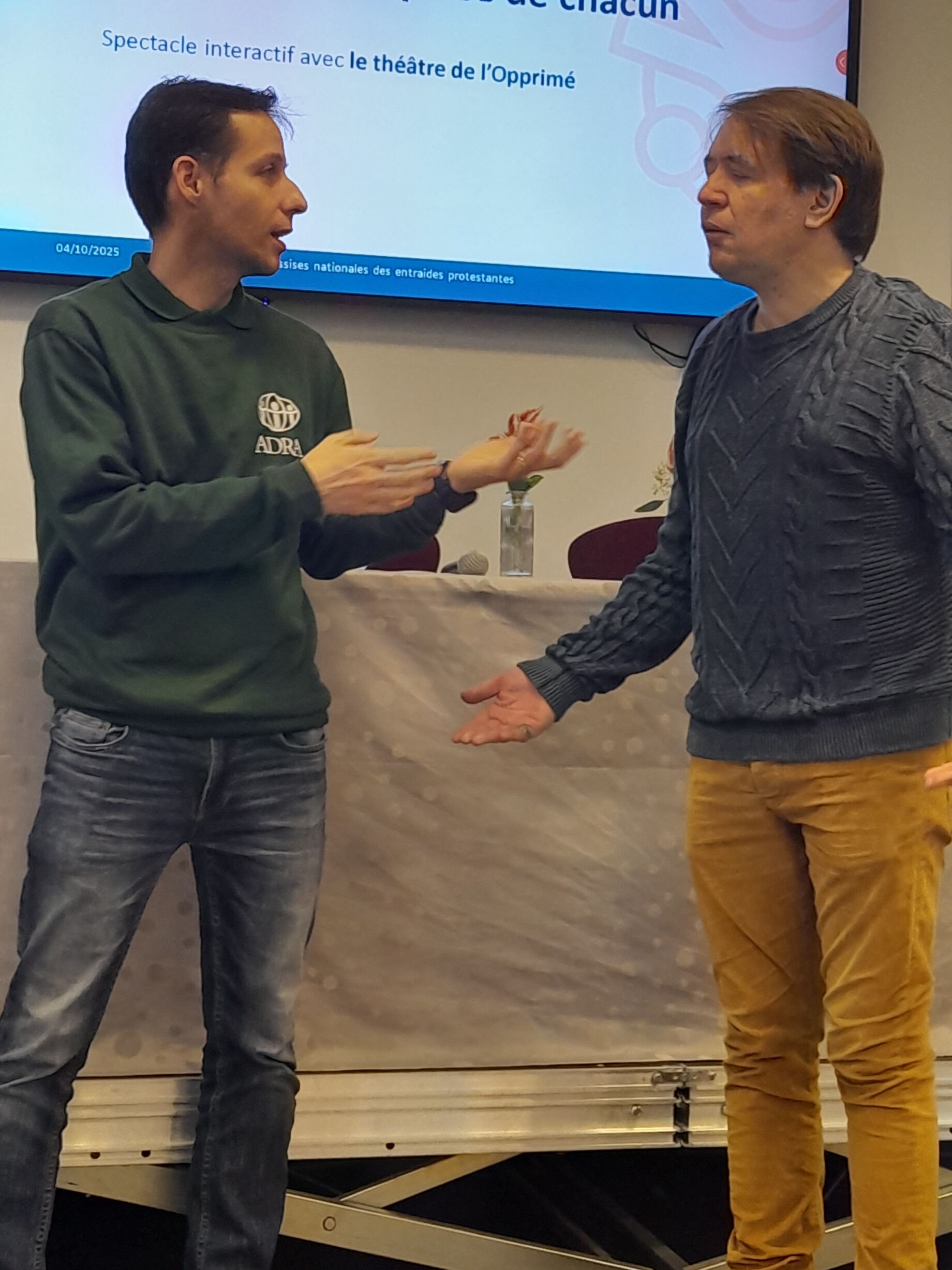 Invités aux Assises des entraides de la FEP2, les comédiens reconnaissent être sensibles aux sujets du don et du bénévolat. Daniel affirme que la question du lien prévaut, pourquoi je fais, ce qui m’anime et anime l’autre, et sur quoi on peut se retrouver en dépit de nos divergences : « Ces questions du donner-recevoir traversent toute notre vie affective, relationnelle, professionnelle. » Julie, bénévole à ses heures dans l’association MIAA3, ajoute : « On s’inspire de nos vies, de ce qu’on connaît, mais aussi de ce que nous disent les commanditaires ; ils nous donnent des pistes, relatent les difficultés rencontrées et, à partir de là, nous travaillons sur les séquences que nous allons proposer. »