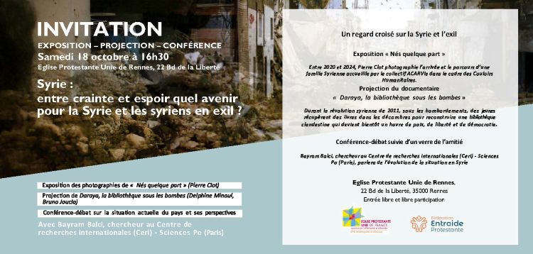 - - Exposition « Nés quelque part ». Entre 2020 et 2024, Pierre Clot photographie l’arrivée et le parcours d’une famille Syrienne accueillie par le collectif ACARVie dans le cadre des Couloirs Humanitaires.