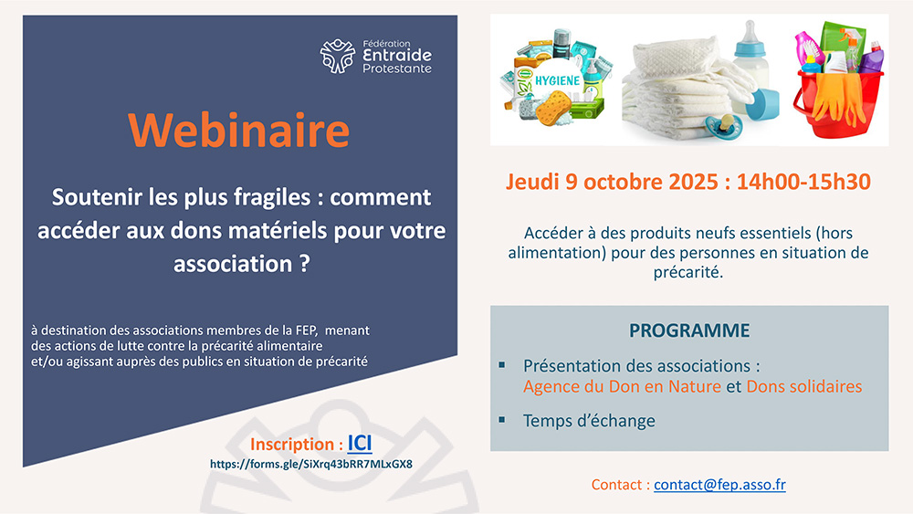 Nous vous invitons à participer à un temps d’information et d’échange avec l’ et , deux associations qui proposent des produits neufs (hygiène, puériculture, entretien…) aux structures accueillant des publics précaires.